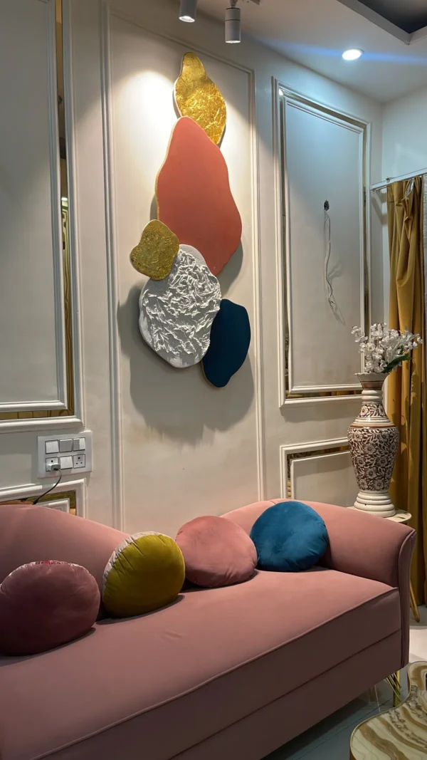 The Colorful Ascension Geometric Wall Art is a contemporary masterpiece that brings vibrancy and dimension to any space. This Geometric Wall Art piece showcases an eclectic mix of shapes, each rendered in a different texture and color, including gold leaf, matte black, vibrant coral, and textured white. Arranged in a dynamic, ascending pattern, these shapes create a visual flow that draws the eye upward, making it an ideal statement piece for high-ceiling rooms or spacious walls in need of a dramatic touch.