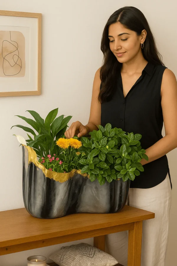 Whether placed on a console table, dining table, or as a coffee table accent, Monarch Noir Resin Planter captures attention with its luxe aesthetics and practical elegance.