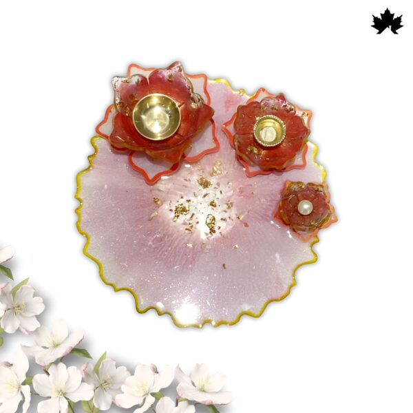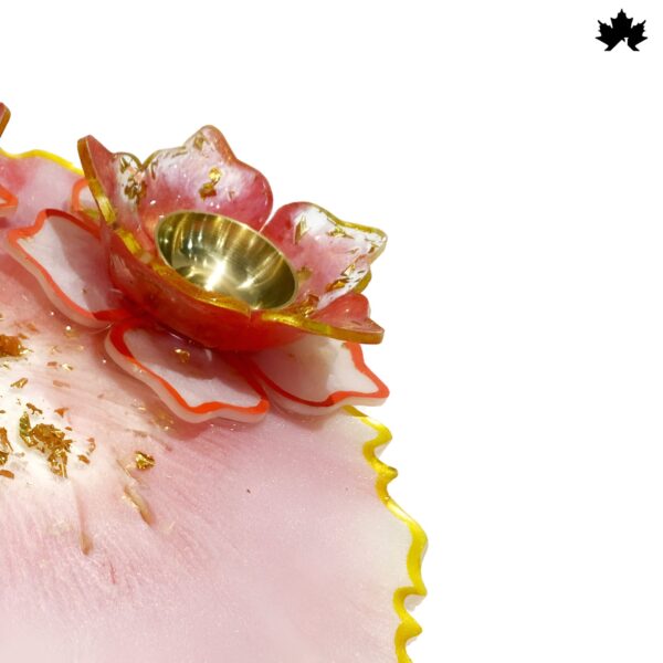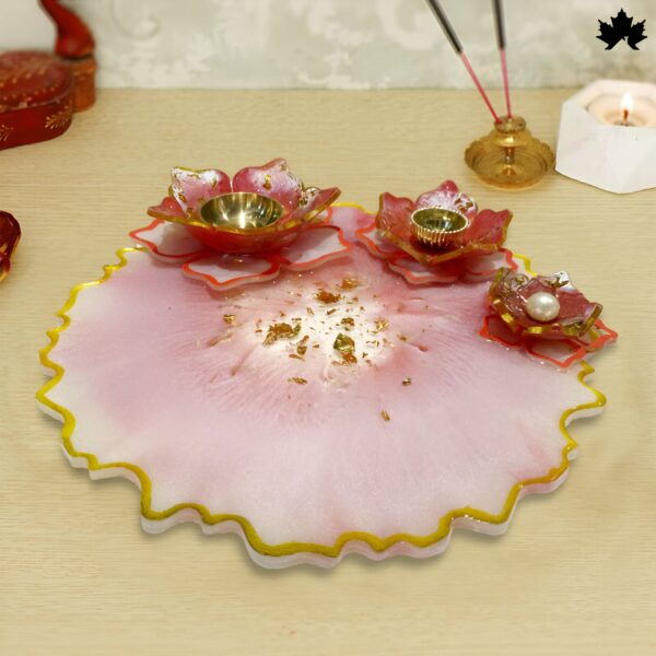 Add a touch of grace to your rituals with this handcrafted pink lotus bowl Pooja Thali. The soft pink tones, golden edging, and embedded gold foil make it the perfect centrepiece for your festive setup. Complete with lotus-shaped bowls and brass katoris, this design stands out in our pooja thali for sale range.
