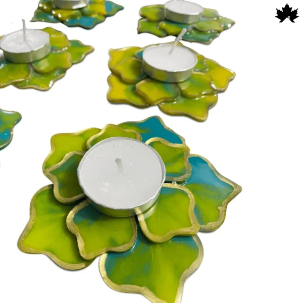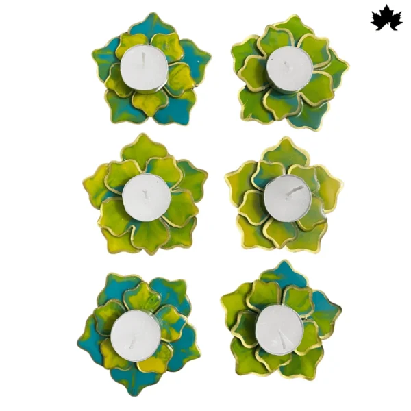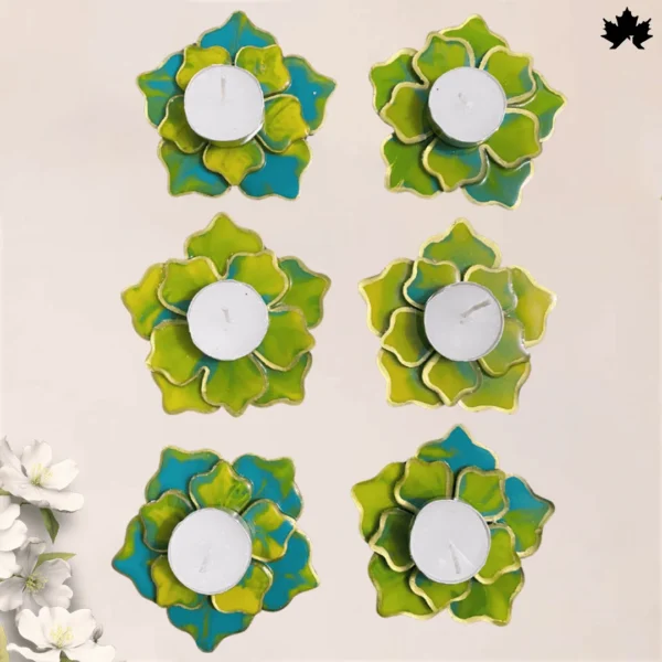 Experience the joy of radiant illumination with our Vibrant Blossom Diya Holder Set. Each holder in this set of four boasts a dynamic blend of green and blue hues, reminiscent of lush gardens and clear skies. Crafted to enhance any festive or serene setting, these holders accommodate tea lights to cast a soft, enchanting glow. Perfect for Diwali, prayer ceremonies, or simply as a decorative touch in your living space.