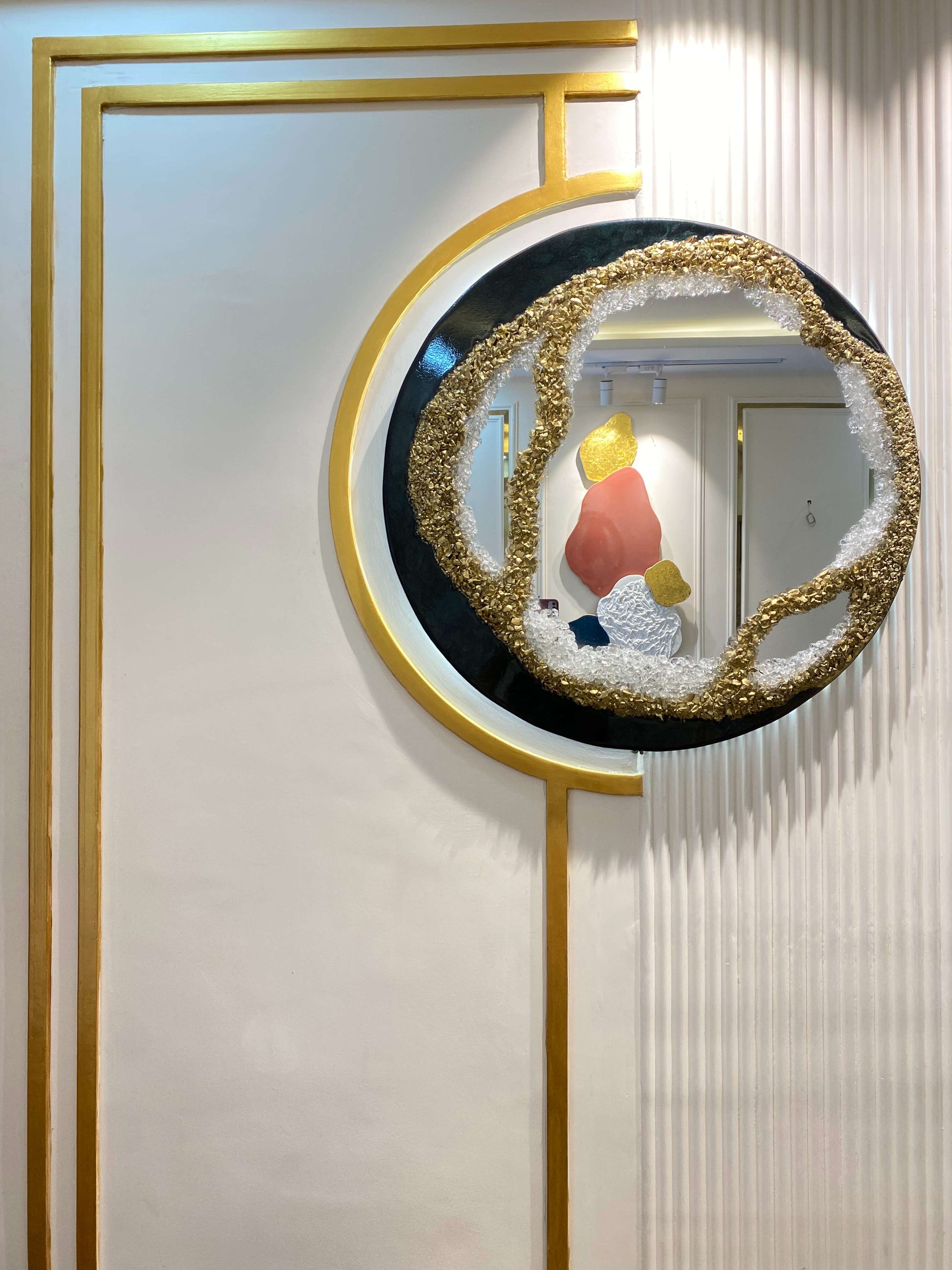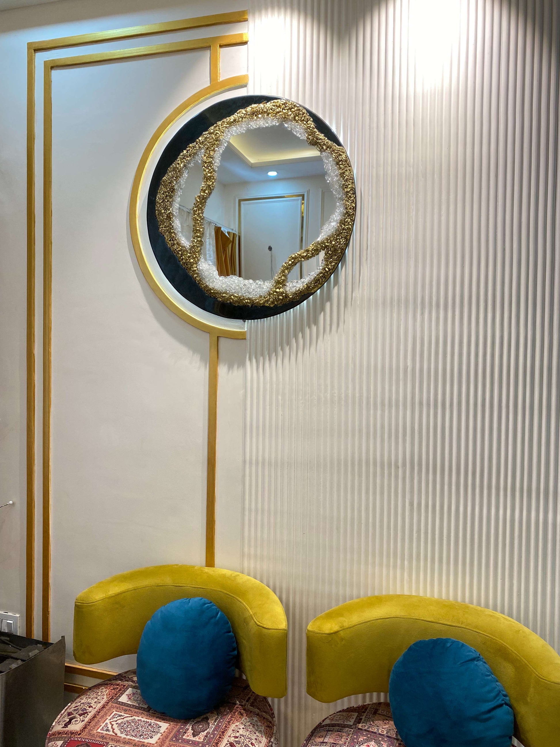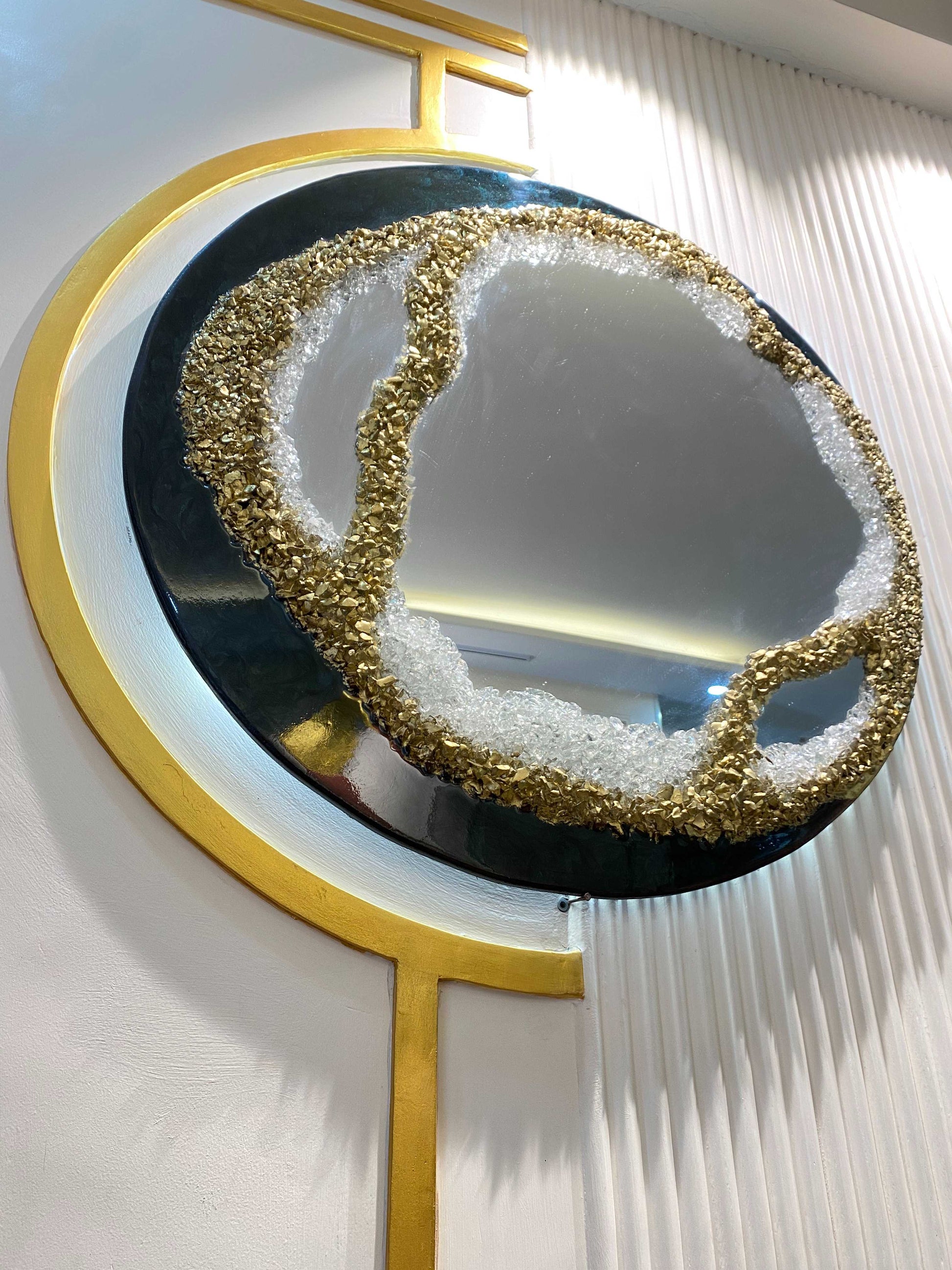 Crystal Aurora Round is a luxury décor piece designed to transform ordinary wall space into a statement corner. The handcrafted resin border features crushed crystal textures and metallic gold detailing that shimmer under ambient lighting. The organic carved opening gives the mirror a sculptural identity, making it more than just reflective glass. If you are searching for a unique mirror for living room décor, this elegant design adds depth, brightness, and artistic flair in one premium piece.