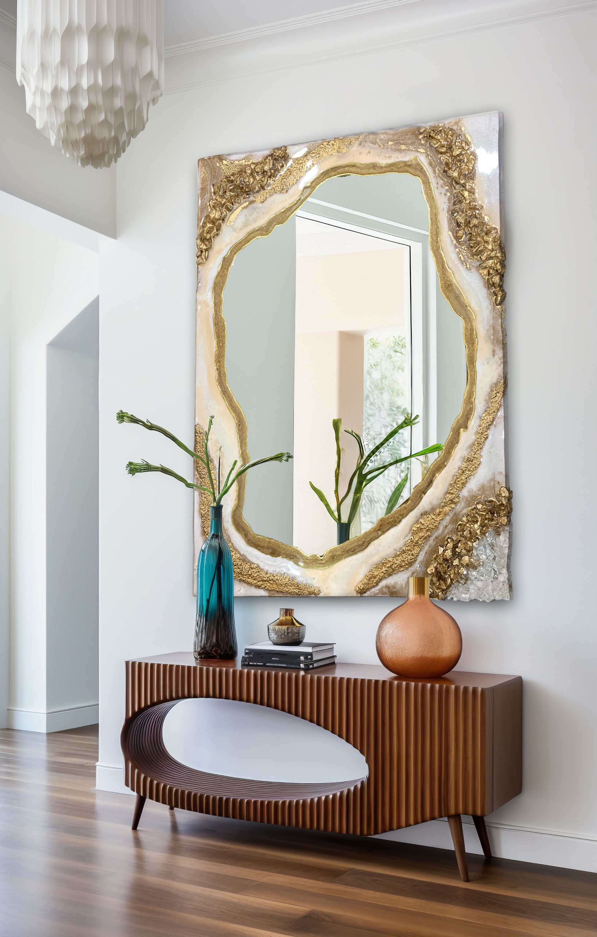 Imperial Geo Frame combines luxury artistry with functional elegance. Hand-layered with resin in ivory, gold, and crystal textures, the frame features a sculpted geode-inspired shape that instantly elevates any wall. Its glossy surface, mineral-like edging, and bold dimensions make it a standout piece in modern, classic, and luxury interiors. If you are planning to buy unique mirrors for home decoration that create a dramatic focal point, this premium handcrafted design adds style, brightness, and sophistication to your space.