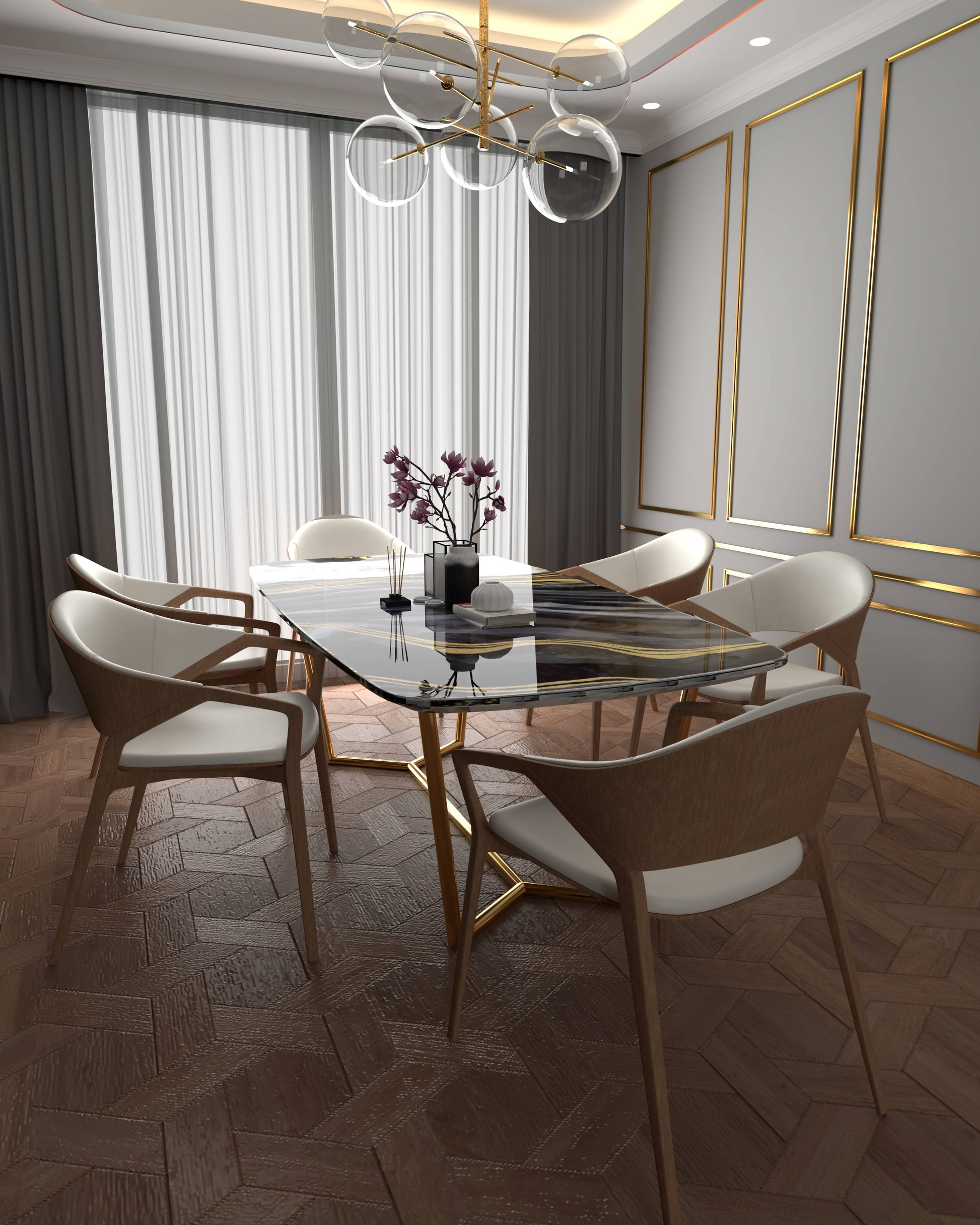 This premium dining table design is crafted for elegant, upscale interiors. Its high-gloss epoxy top with rich natural wood grains adds sophistication to your dining space. Paired with a gold-finish designer base, it delivers a stunning balance of artistry and luxury.