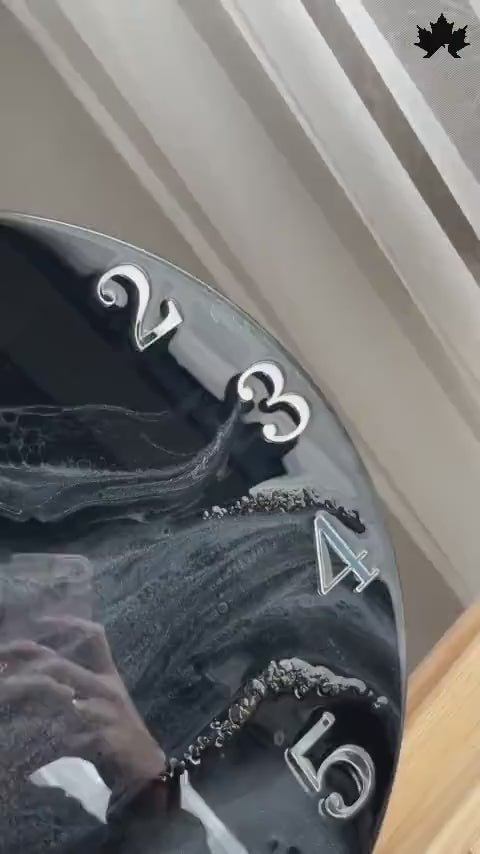 This handcrafted resin clock blends modern elegance with a bold monochrome palette, making it a standout piece for upscale interiors. Designed as part of our curated premium wall clock online collection, it features a deep black resin base with swirling silver patterns and raised metallic numerals. The sleek silver hands add refined contrast, making it ideal for bedrooms, living rooms, offices, or luxury minimalist décor.