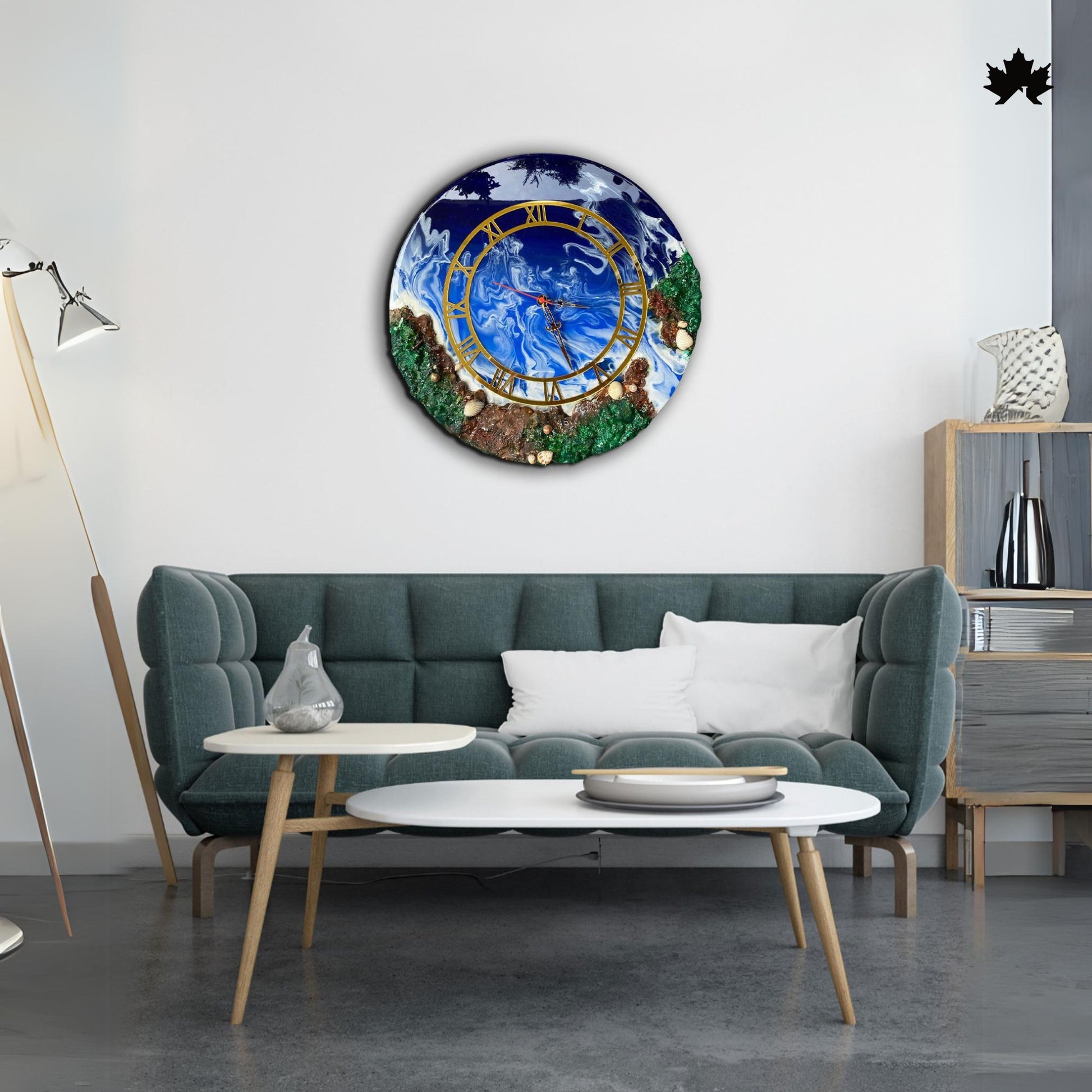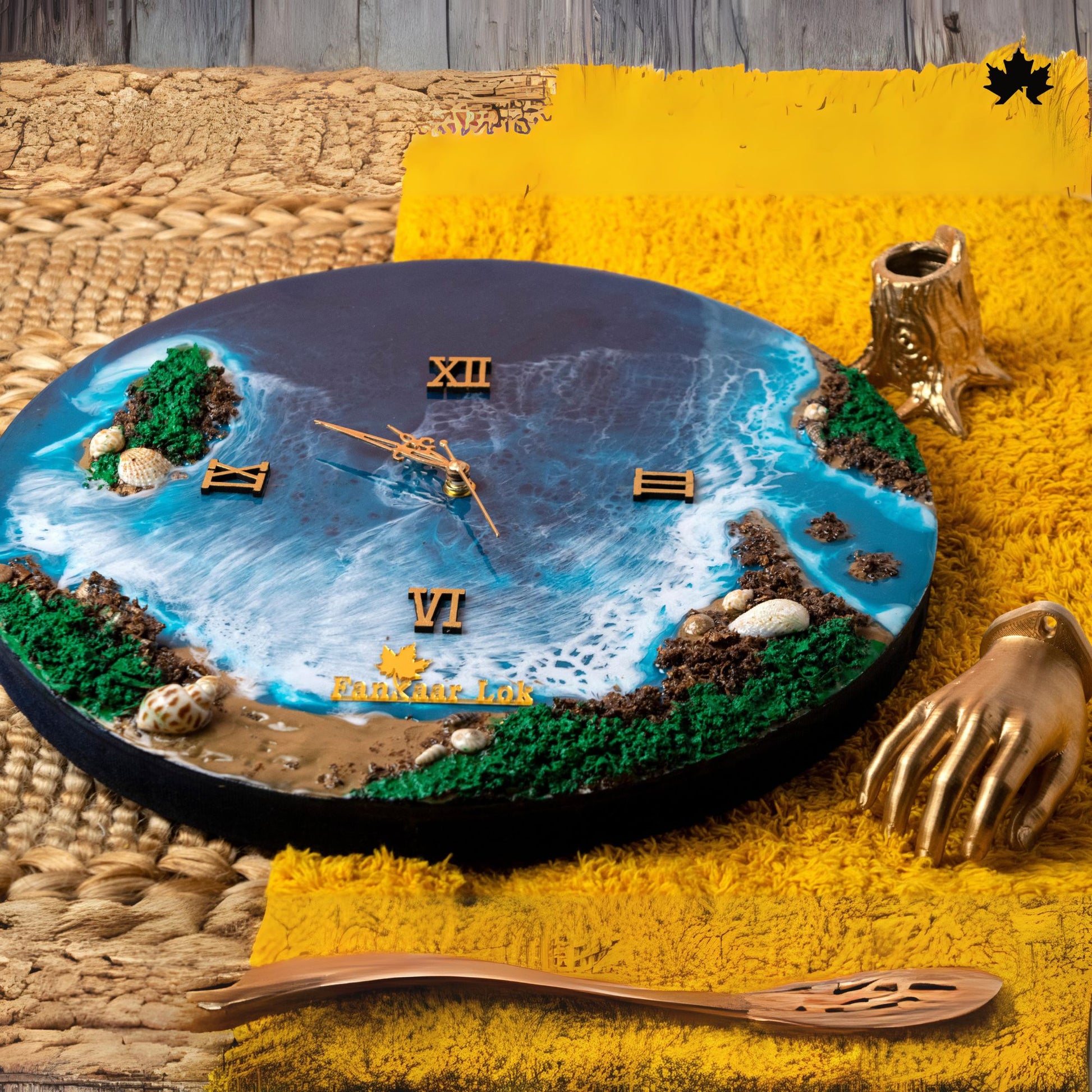 This round designer wall clock collection brings the beauty of the ocean into your home with stunning handcrafted resin artwork. Each variation features intricate wave patterns, realistic shoreline textures, miniature stones, and lush greenery—capturing the essence of a beach scene in a functional art piece. Available in three unique designs, each clock showcases premium craftsmanship, rich coastal colors, and elegant gold or white hands. Perfect for anyone looking to add a refreshing coastal touch to their interiors with a premium round designer wall clock.