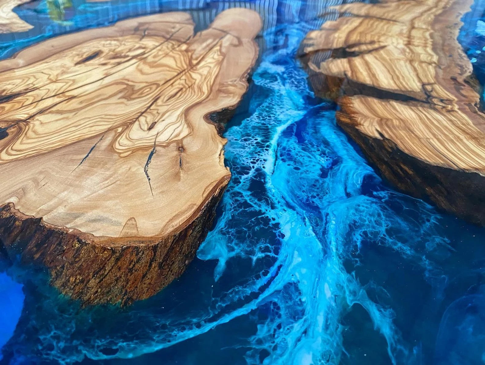 Color: Natural wood tones with deep blue resin accents