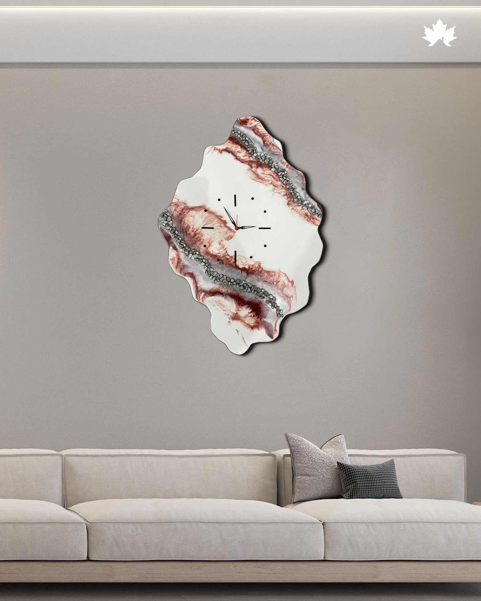 This wall clock new design showcases an artistic fusion of flowing resin textures, sculpted edges, and premium craftsmanship. Hand-poured with intricate detailing, the abstract design gives the clock a fluid, organic form that feels both modern and luxurious. The sculpted silhouette adds depth and dimension, while the metallic Roman numerals and sleek hands elevate the overall look. This wall clock new design effortlessly becomes the hero piece of any room, bringing sophistication and artistic flair to your interior.